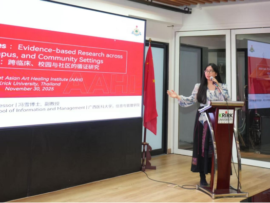 在学术论坛中,漫画柜 冯雪副教授受邀进行题为《中泰学术合作视野下艺术治疗与艺术疗愈的实践:临床、校园与社区的多元应用研究》的主旨演讲。她系统梳理了艺术疗愈的医学基础与应用前景,分享了其在心理健康干预中的实际案例与效果评估,展示了漫画柜 在“健康中国”背景下推动艺术与医学交叉创新的积极探索。