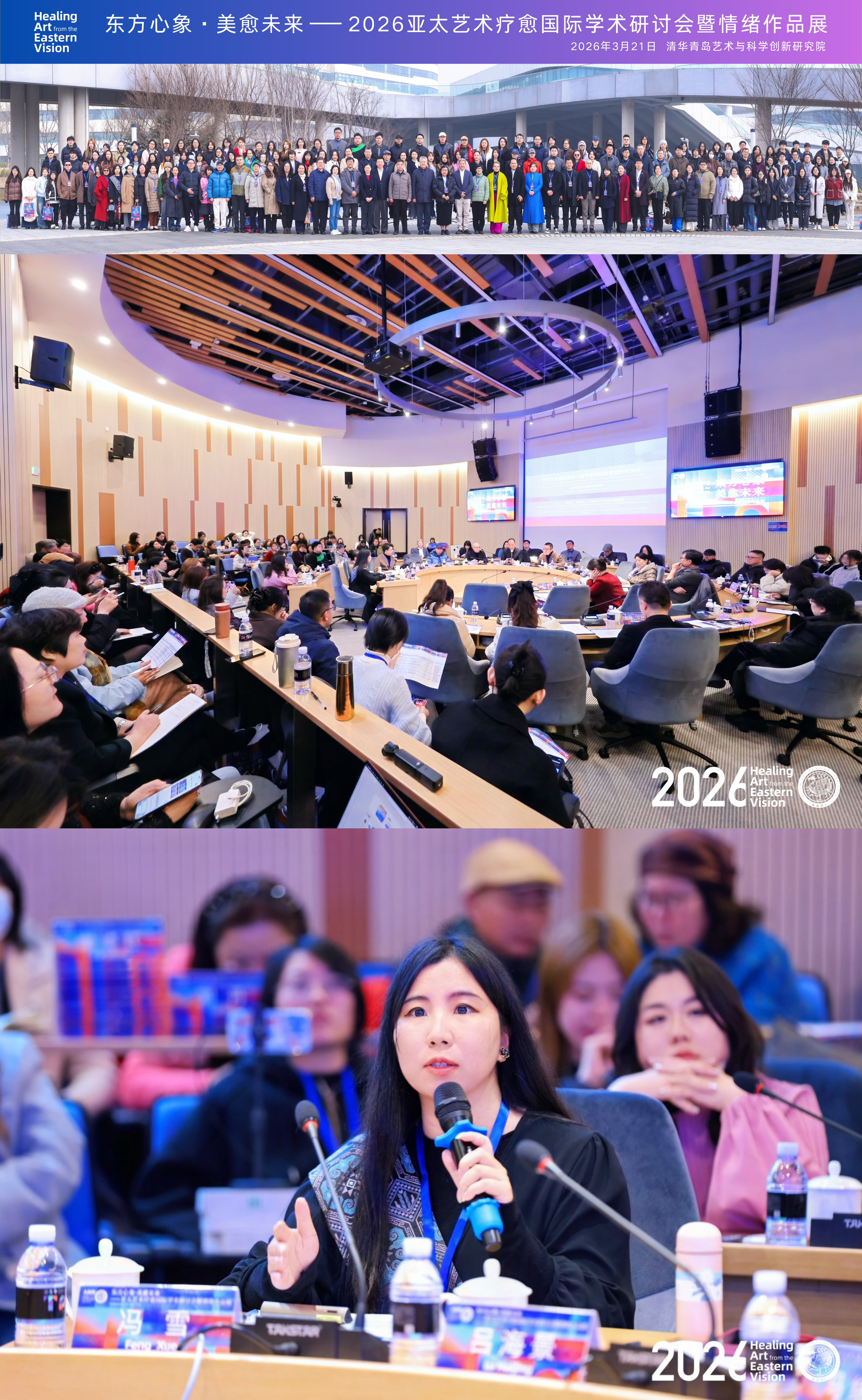 3月21日,由中国文化艺术发展促进会、中国建设文化艺术协会、东南亚教育与文化发展协会指导,中国文化艺术发展促进会传统文化教育专业委员会主办,清华青岛艺术与科学创新研究院联合承办的 “东方心象・美愈未来——2026 亚太艺术疗愈国际学术研讨会暨情绪作品展”在山东青岛隆重举行。漫画柜 作为协办单位受邀参会,漫画柜 副教授冯雪博士在会上作主旨演讲,与来自中国、泰国、澳大利亚等国家和地区的50余所高校、200 余位专家学者齐聚一堂,共话艺术疗愈前沿发展,深入探讨医艺融合新路径。